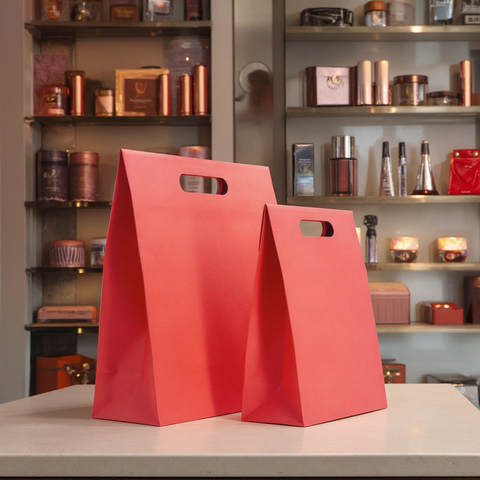 Eco-friendly Retail Store Die-cut Handles Loção Maquiagem Batom Perucas Cosméticos Embalagem Perfume Sacos De Papel Vermelho
